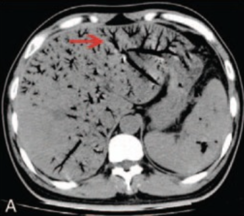- ガスは主に肝内門脈に見られ門脈気腫などとも言われる